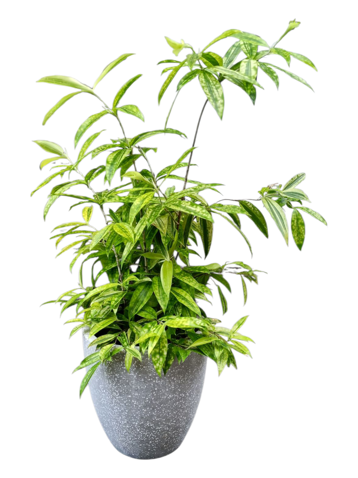 艶のある深い緑の葉に、散りばめられたような黄色の斑が美しい「ドラセナ・スルクローサ・サイアムビューティー」。